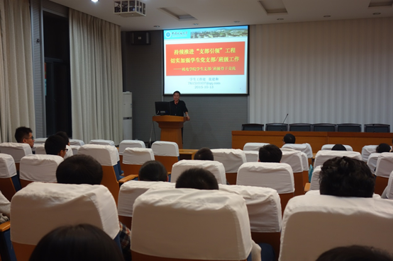 他强调,学生党支部在学校各项改革与事业发展中发挥了重要作用,大学生党的支部委员会要成为引领大学生刻苦学习、团结进步、健康成长的班级核心。“党徽照我行——支部引领”工程的实施要紧紧围绕“品德高尚、基础厚实、专业精深、知行合一”的人才培养目标、按照“党徽照耀、支部引领、立项建设”的总体思路建设。其次,工程建设目前存在的问题主要有:不知道怎么做、覆盖面不清楚、存在“两张皮”现象。开展政治理论学习的策略要从学习政治理论的作用着手,联系思想、生活及找到相关问题。最后,他强调进一步加强工程建设的策略要注重创新党组织设置模式,把党组织建到学生身边;学生党组织要切实履行职责,引领学生共同进步;鼓励学生党员争做先锋模范,带动学生参与班级管理;建立联动机制,推动学生主体性发展。张老师还提到开展工程立项建设要注重根据年级特点来分年级开展,他着重提到二三年级的的学生要注重结合社会调查等实践育人活动,开展以“支部带动校风学风建设、学业发展、科学精神的培育、团组织建设、班级建设、宿舍文明建设、创新创业工作”的“七个带动”活动。