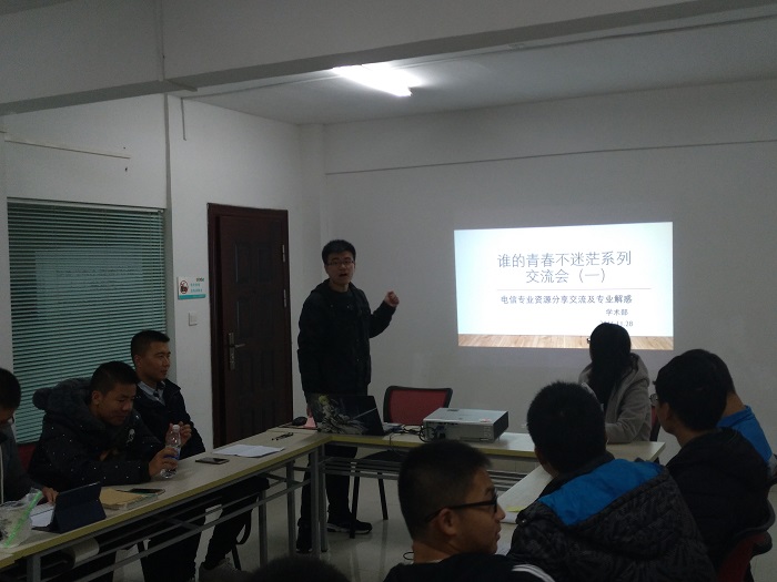 (通讯员 武志强)11月28日晚7:00,“谁的青春不迷茫”系列活动之电子信息工程专业专场交流会在63栋3号学习室举行。2014级电信专业王慧娇担任主讲人,院学生会学术部副部长韩荣及2016级电信专业学生参加学习。