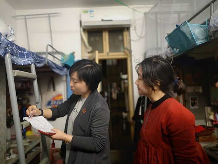 在走访学生宿舍前,老师们与宿舍管理员进行了近期宿舍管理方面工作的交流。之后在于晓舟的带领下,老师们主要对学生在寝室的寝室卫生、学习情况、身体状况、违章电器、夜间回寝等方面进行了询问与了解。此外,老师们走访了优秀学生宿舍,并对他们的内务整理和取得的成就做出了肯定与赞扬。