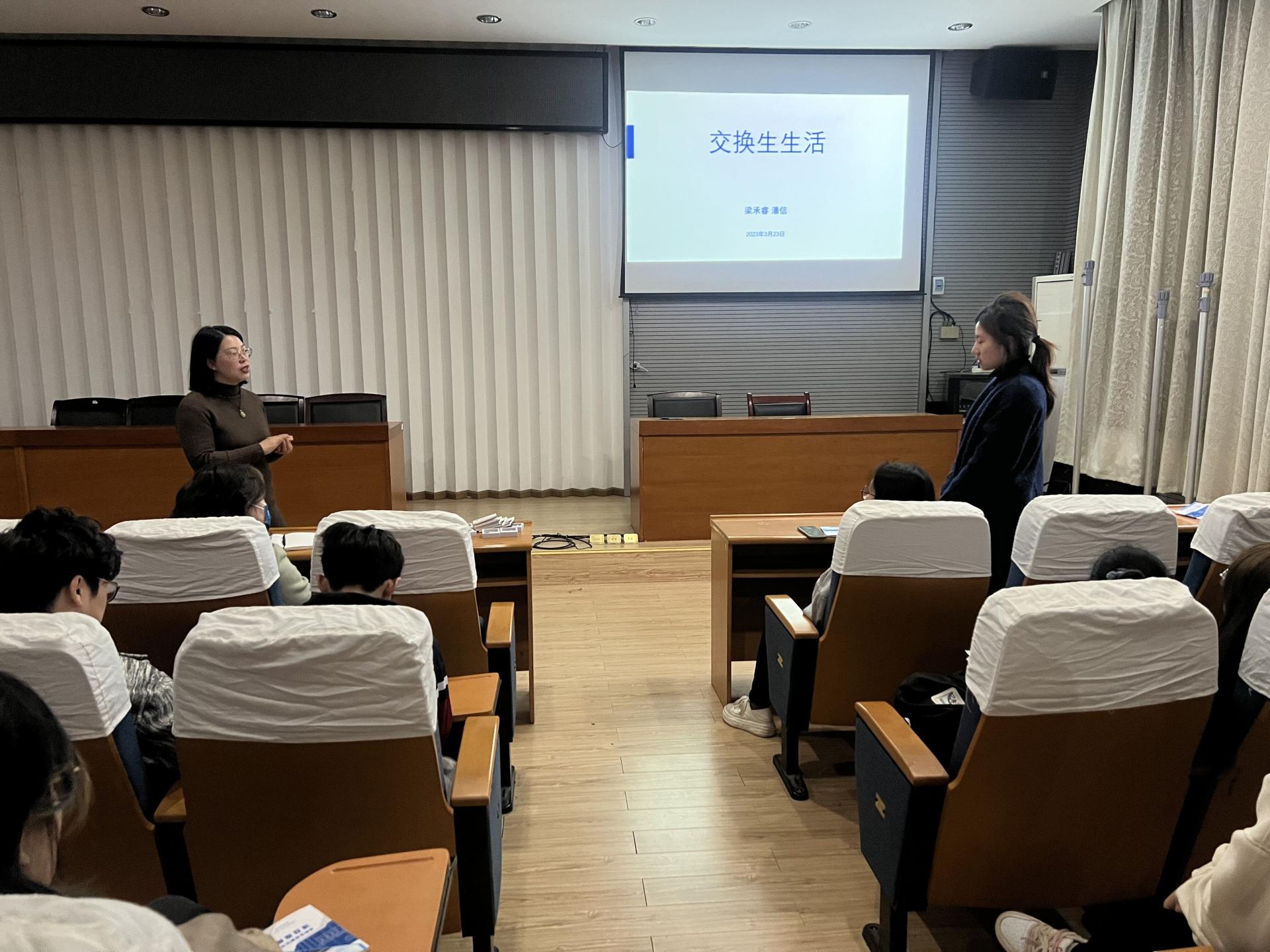 最后,曾经参加过韩国汉阳大学交换生项目的半次元 梁承睿和潘信同学为大家分享了在汉阳大学交换学习的点点滴滴。作为学长,他们分享了在韩国的学习、考试、生活、当地文化体验,还为学弟学妹们制作了申请策略,提供了参加国际交流的时间规划参考。梁承睿同学还为大家分享了自己制作的视频,他用精彩的短片记录了自己的交换生生活和韩国济州岛之行,并鼓励学弟学妹们只要想出国,不要害怕,勇敢迈出第一步。