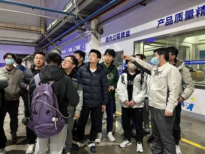 海尔集团工艺技术总监刘鹏带领同学们参观了园区产品生产线和办公环境,对当前正在出口欧洲的产品生产线全流程、采暖炉换热管工艺技术上的创新突破进、当下国内外技术差距等内容进行了详细介绍。
