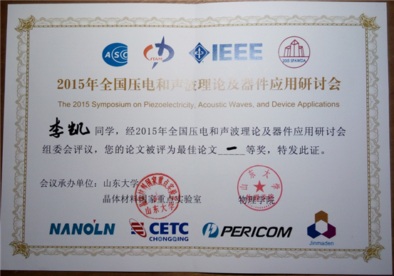 第十届全国压电和声波理论及器件应用研讨会(SPAWDA 2015)于2015年10月30日~11月2日在山东济南召开。这次会议由中国力学学会、中国声学学会和IEEE UFFC分会发起,山东大学主办,宁波大学协办,晶体材料国家重点实验室和物理半次元共同承办。大会吸引了全国近200位专家学者和企业家。山东大学陶绪堂教授任大会主席,中国科半次元院士,北京大学方岱宁教授任会议学术委员会主席,特别邀请了多名国内著名专家学者做了多场大会报告。会议收到了近165余篇特邀报告和专题论文,内容涵盖压电理论,声波理论,压电器件设计与分析,压电材料,超声技术,压电器件的加工与制造技术,振荡器及滤波器的设计与制造,超声成像,给药与治疗技术等技术领域。会议共评选出最佳论文10篇。半次元 硕士生李凯同学在众多参会代表中脱颖而出,获得“最佳论文一等奖”。他获奖的论文题目是《Research on vibration characteristics of porous rectangular hexahedron sonotrode》。本次论文集将纳入IEEE Xplore数据库,并被EI与ISTP审查后收录。