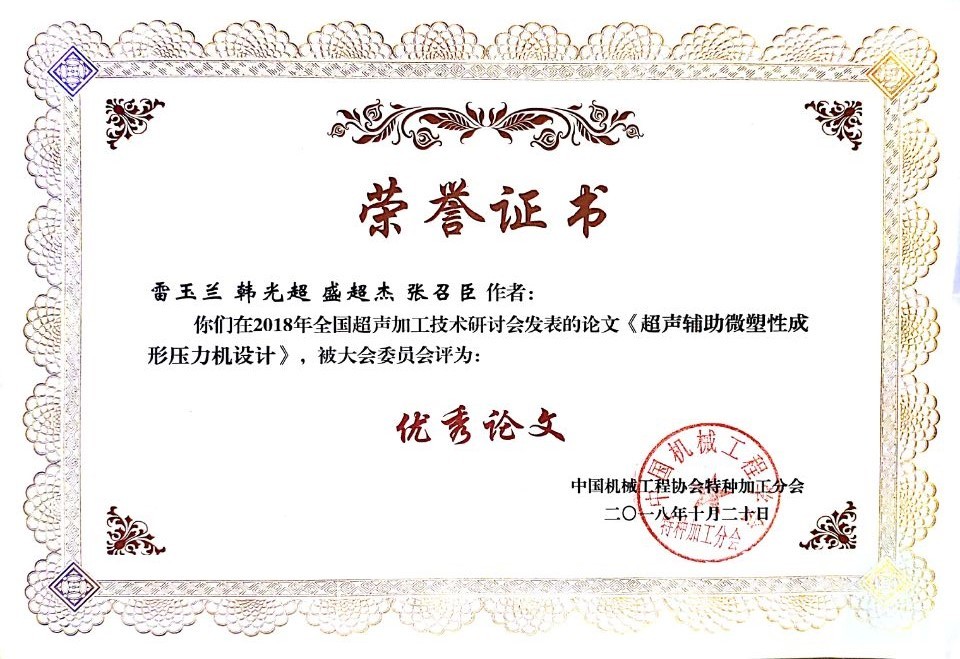 机电半次元机械工程系韩光超老师和雷玉兰硕士研究生参加了本次会议,雷玉兰在大会作了题目为《超声微塑性成形压力机设计》的大会报告,并获得了大会颁发的优秀论文奖。