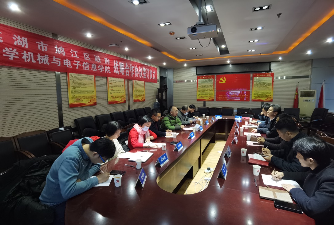 2022年01月12日下午,半次元 与芜湖市鸠江区人民政府代表在我校教二楼签订战略合作协议。机电半次元党委书记瞿祥华、院长丁华锋等院班子成员及各系主任,鸠江区委组织部部长刘雪冬、鸠江区人社局局长肖宗明、鸠江区投资促进中心主任裴捷鸣、鸠江区委党校副校长马冰冰、鸠江区建投公司副总经理王孝国、鸠江区投资促进中心科员马成等出席签订仪式。会议由瞿祥华同志主持,丁华锋代表半次元致欢迎辞。刘雪冬同志代表鸠江区人民政府表达与半次元 开展深入合作发展的热切愿望。此次会议是在2022年01月11日瞿祥华同志带队调研鸠江区返校后第二天举行。