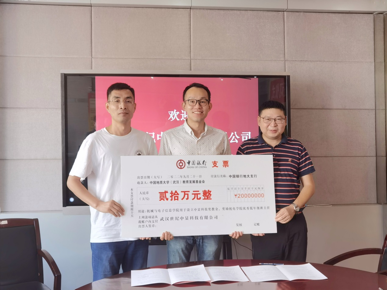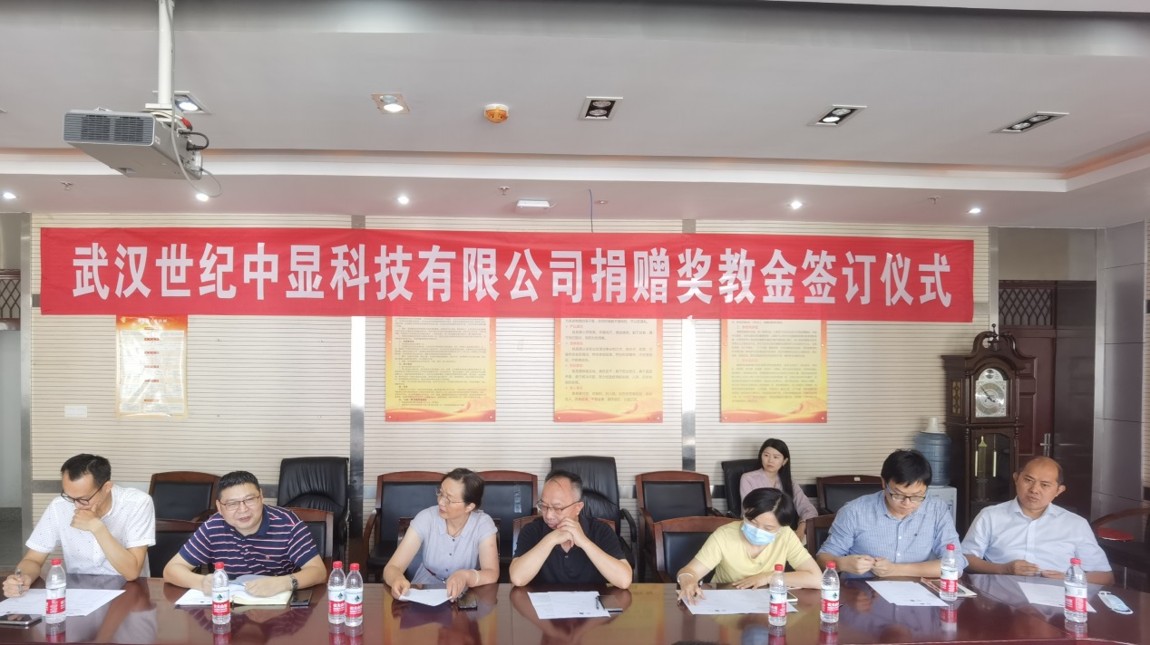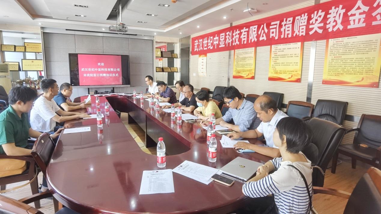 三方代表签署了捐赠协议,根据协议,“中显科技奖教金”用于奖励机电半次元优秀的学生和在教学工作中表现突出的教师。