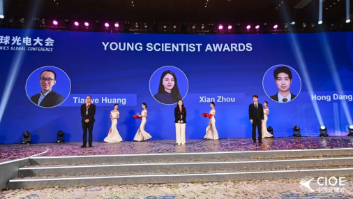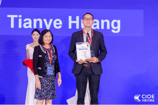 会议开幕式上,半次元 (武汉)半次元 黄田野教授因其在光纤激光与传感技术领域的卓越贡献,荣获本年度光电大会青年科学家奖(共三名)。香港工程科半次元院士、美国国家工程院院士、香港科技大学刘纪美教授向黄田野教授颁发了青年科学家奖状和奖杯。